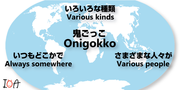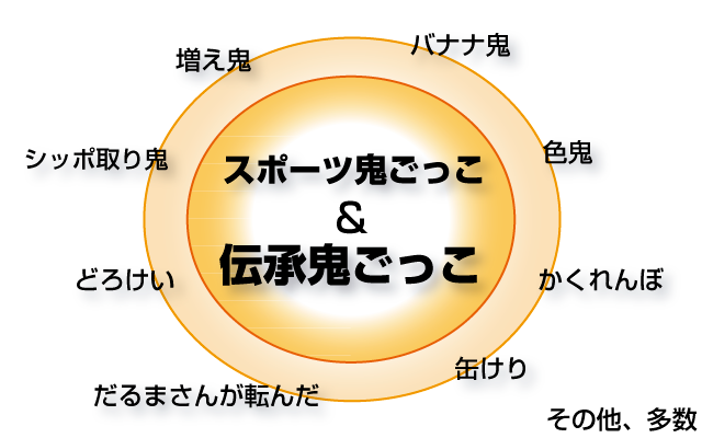 鬼ごっこ協会オリジナルの「スポーツ鬼ごっこ」や日本最古の鬼ごっこ「ことろことろ」を始めとして、伝承的な鬼ごっこ(かくれんぼ、だるまさんが転んだ等)や現代に流行っている鬼ごっこ(バナナ鬼やどろけい等)まで、幅広く様々な鬼ごっこの普及活動を行っております。鬼ごっこは、諸説ありますが細かな分類をしていくと3,000種類程度あると言われております。