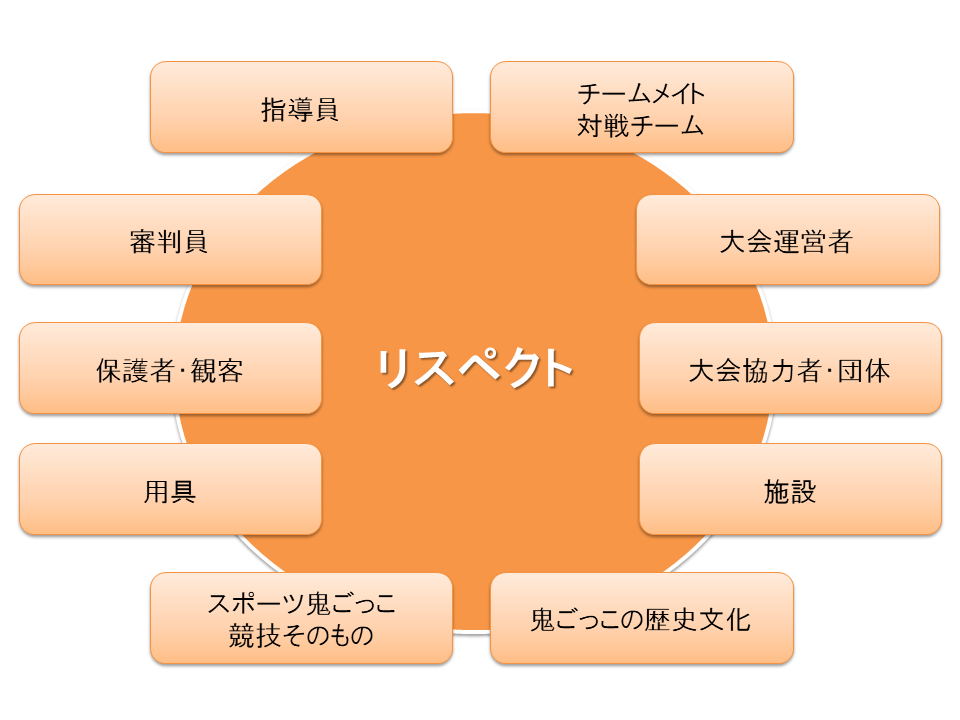 リスペクトとは、スポーツ鬼ごっこや各種鬼ごっこに取り組むうえで、他者を尊重して、互いに敬意をもって活動に取り組む姿勢のことです。チームメイト、対戦チーム、審判員、指導員、大会運営者、保護者、観客、大会協力者・団体、用具、施設、スポーツ鬼ごっこという競技そのもの、鬼ごっこの歴史文化に、それぞれがリスペクトすることを、関係者全てに求めています。
